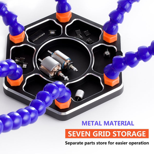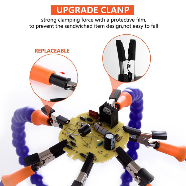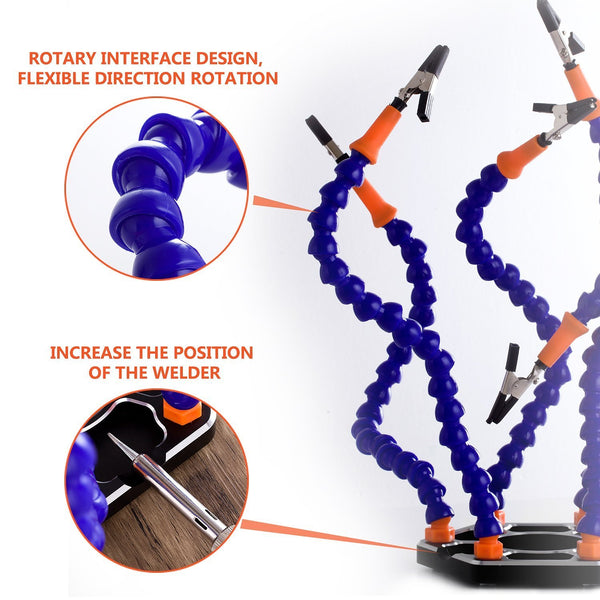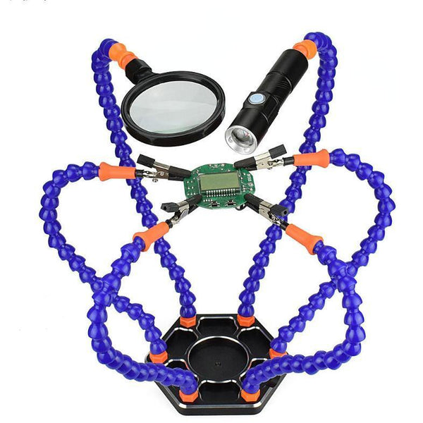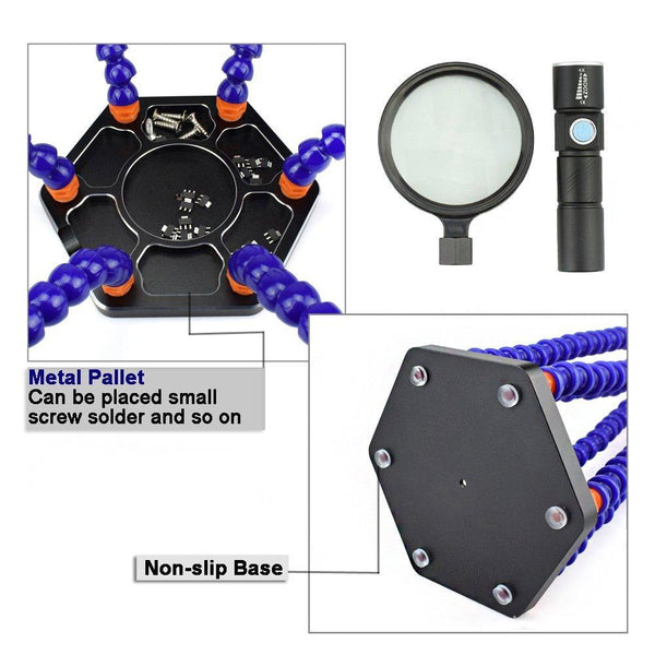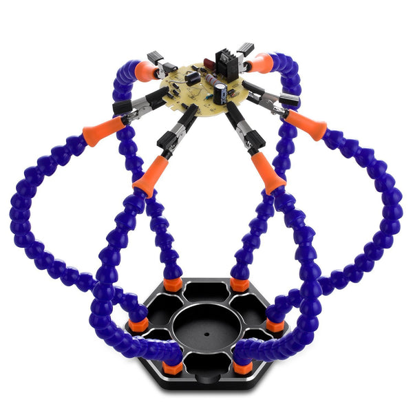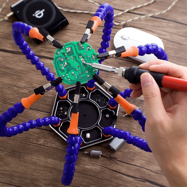 The Octopus Welding Station quickens soldering, electronics, and DIY projects, allowing you to finish your work faster than ever before! Our Third Hand makes positioning a breeze with flexible arms. This high quality helping hands soldering tool has 6 flexible gooseneck helping hands,the arms are not only flexible but also firm so they don't wiggle or loosen up as you are working. Very handy for grabbing a hold of small wiring and plates while soldering.Perfect for computer boards, jewelry makers and arts crafts hobbyists.
