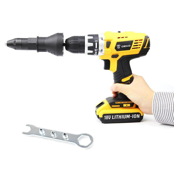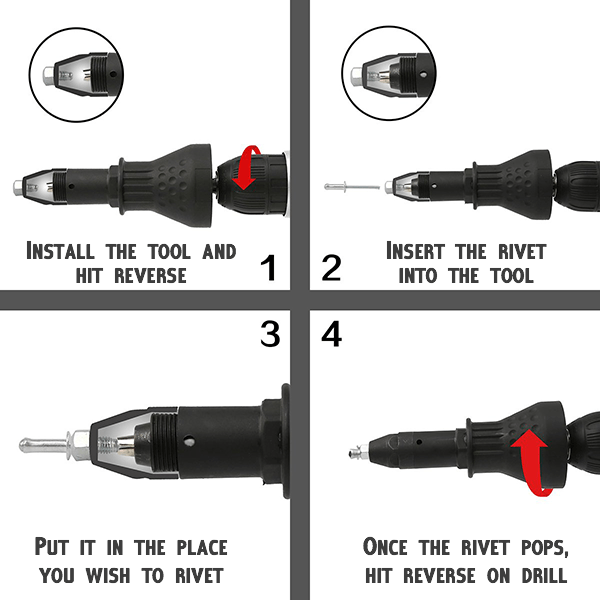 Easily converts cordless, Pneumatic or corded drill into riveter.