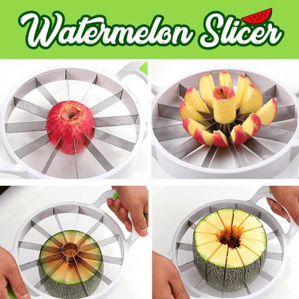 - Just place the center of the 8" diameter slicer on the center of your fruit and press down. The 1" serrated stainless steel blades will core your fruit and give you 12 evenly sliced wedges.